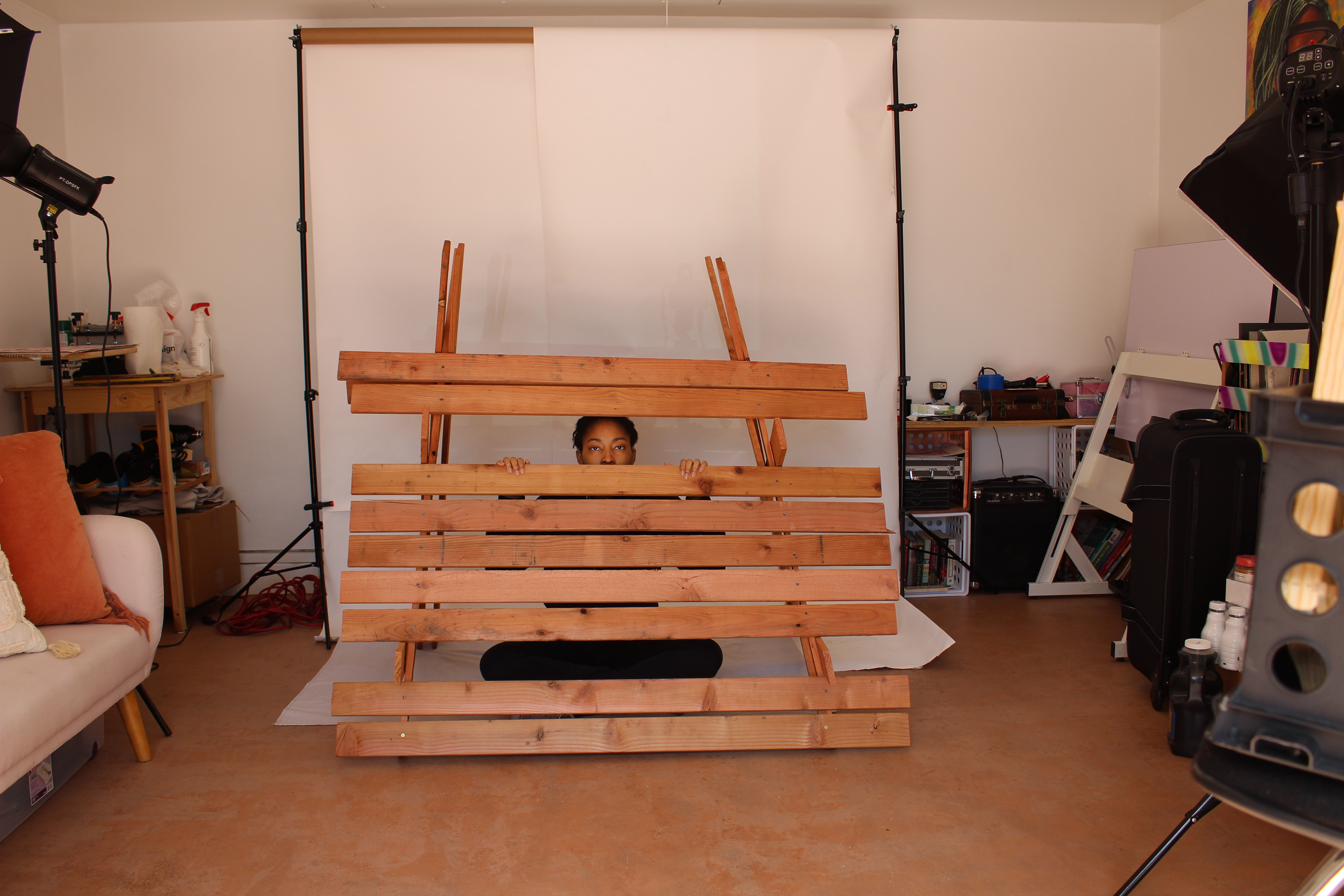 To replicate the one in the photo, I designed a wooden structure that could be easily built and taken down. In my studio, my mom helped me build this.
