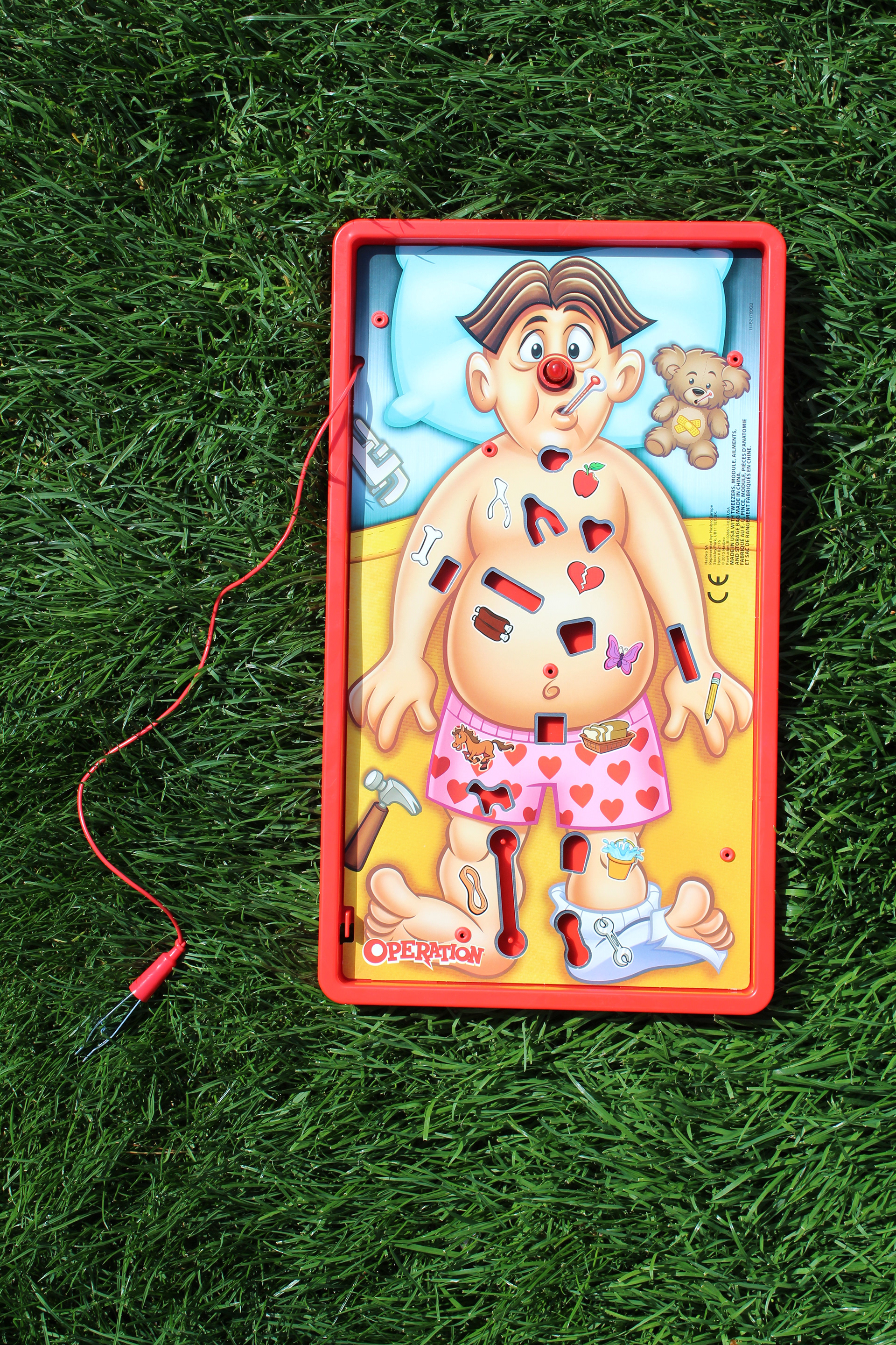 I took a photo of my personal Operation board on top of well-manicured grass at my high school. I wanted the board to look real and the best way I knew how to do that was practically, through photography.
